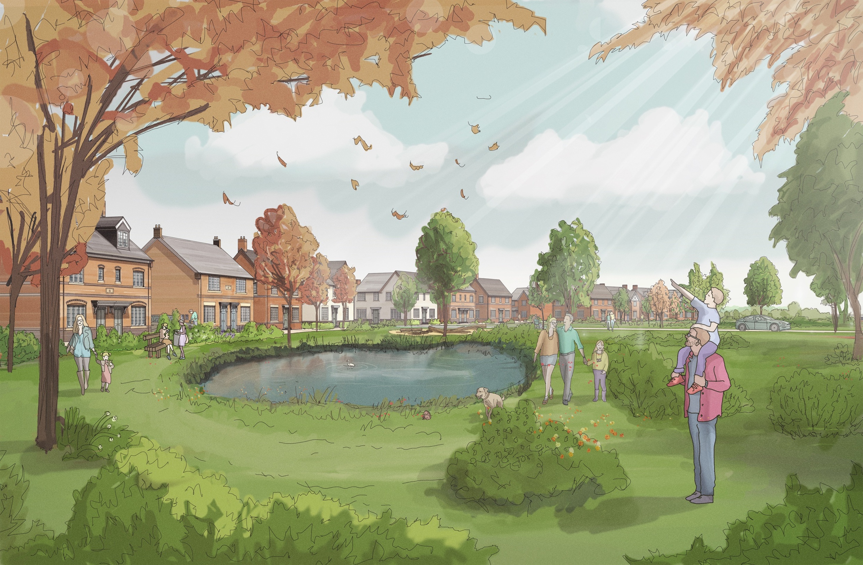 A proposed new neighbourhood east of Eccleshall, delivering up to 480 high-quality homes, specialist older peoples housing, a new primary school, a new primary care hub, and extensive tree planting and public green open spaces.